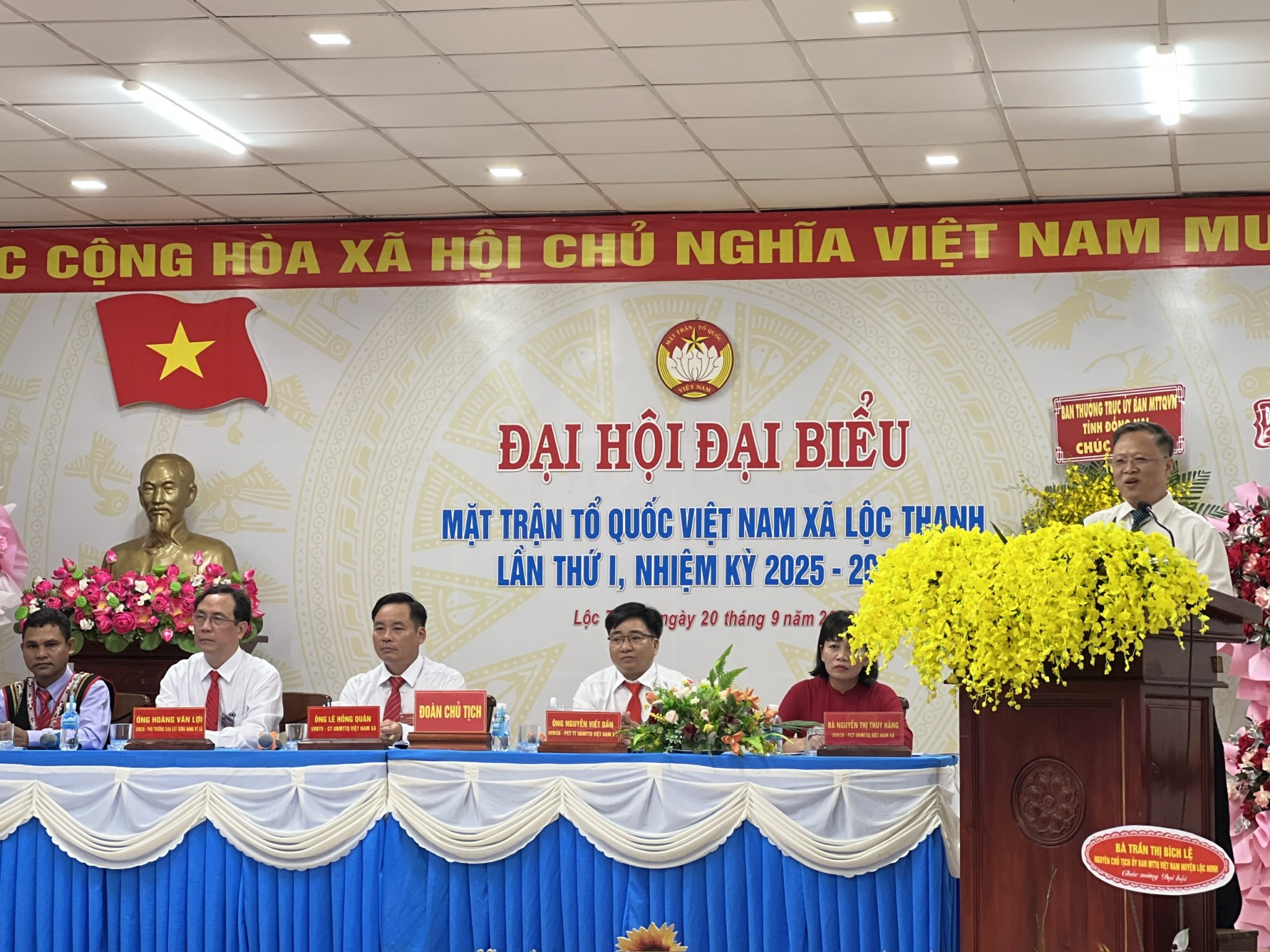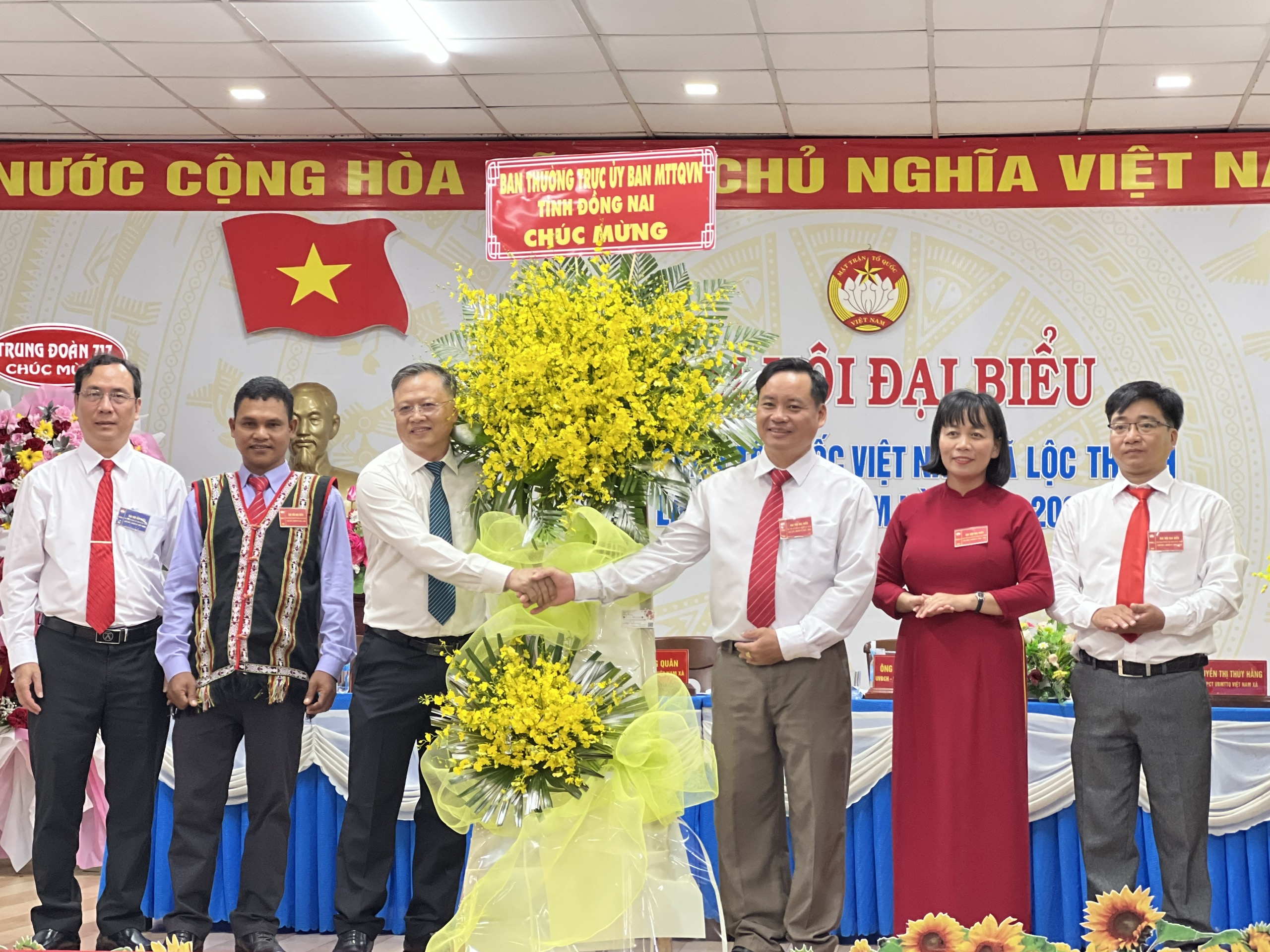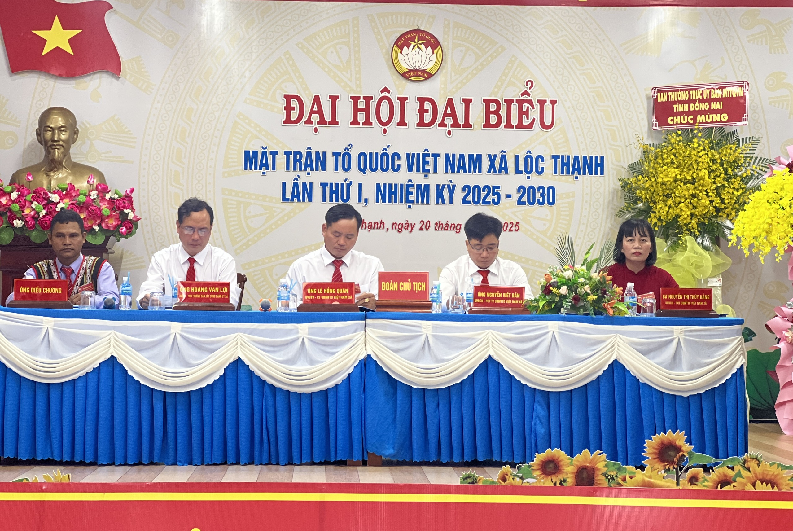 Phó Chủ tịch Ủy ban MTTQ Việt Nam tỉnh Đồng Nai Nguyễn Tấn Phú tặng hoa chúc mừng Đại hội Đại biểu MTTQ Việt Nam xã Lộc Thạnh lần thứ I, nhiệm kỳ 2025-2030. Ảnh: Thanh Tuyền