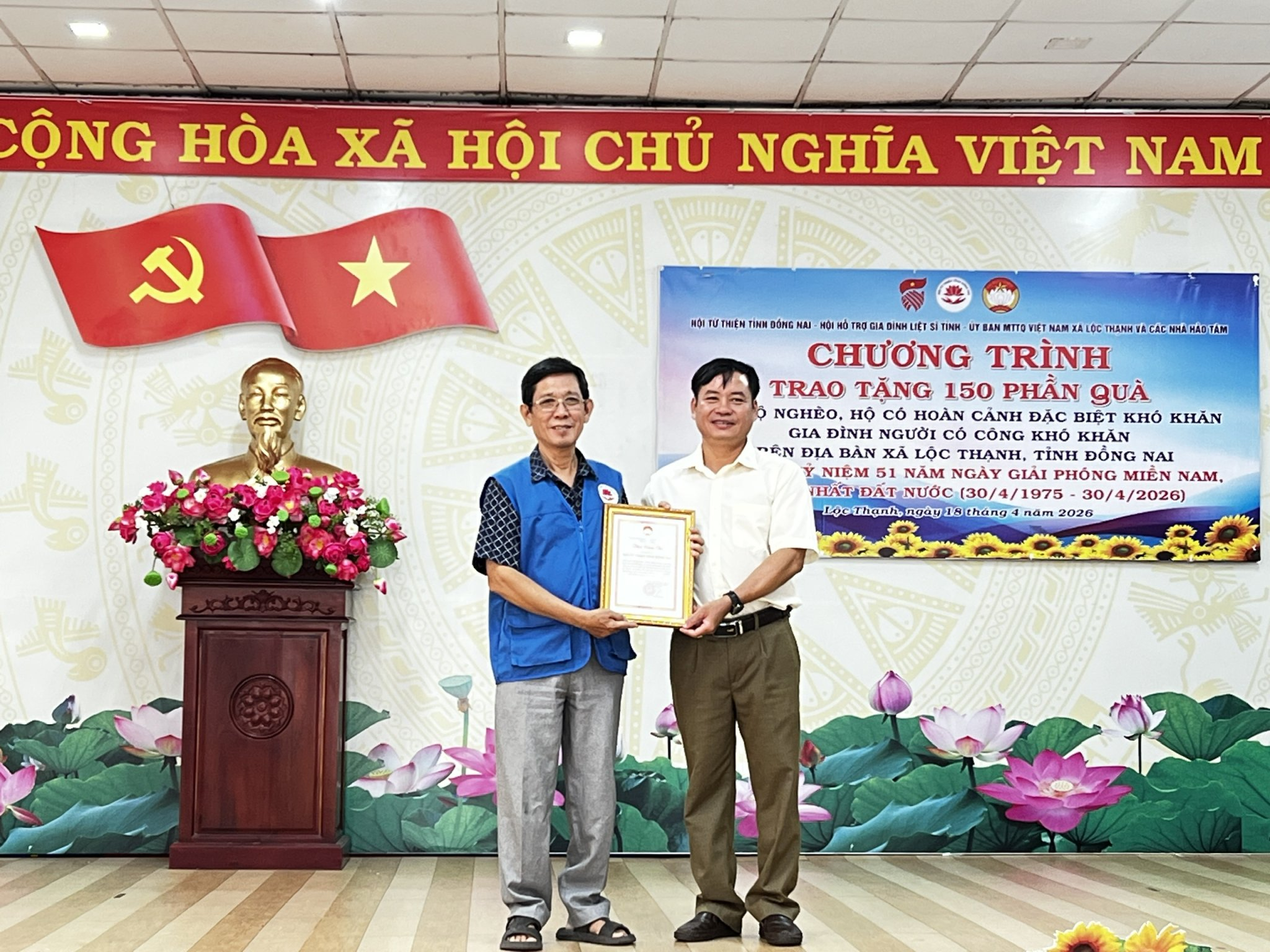 Nhân kỷ niệm 51 năm Ngày Giải phóng miền Nam, thống nhất đất nước (30/4/1975 – 30/4/2026) và Ngày Quốc tế Lao động 1/5, sáng ngày 18-4-2026, tại Nhà văn hóa xã Lộc Thạnh, Hội Từ thiện tỉnh Đồng Nai phối hợp Hội Hỗ trợ gia đình liệt sĩ tỉnh, Đảng ủy – UBND – Ủy ban MTTQ Việt Nam xã Lộc Thạnh và các nhà hảo tâm tổ chức chương trình trao tặng quà cho hộ nghèo, hộ có hoàn cảnh đặc biệt khó khăn và gia đình người có công khó khăn trên địa bàn.