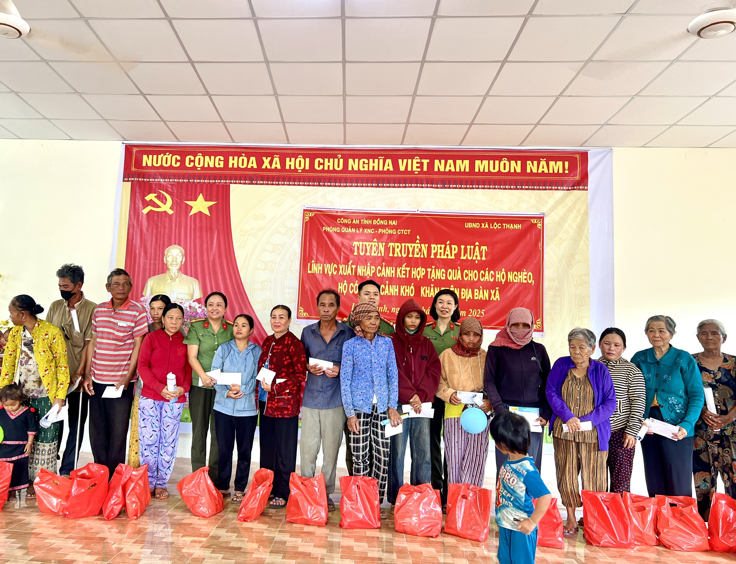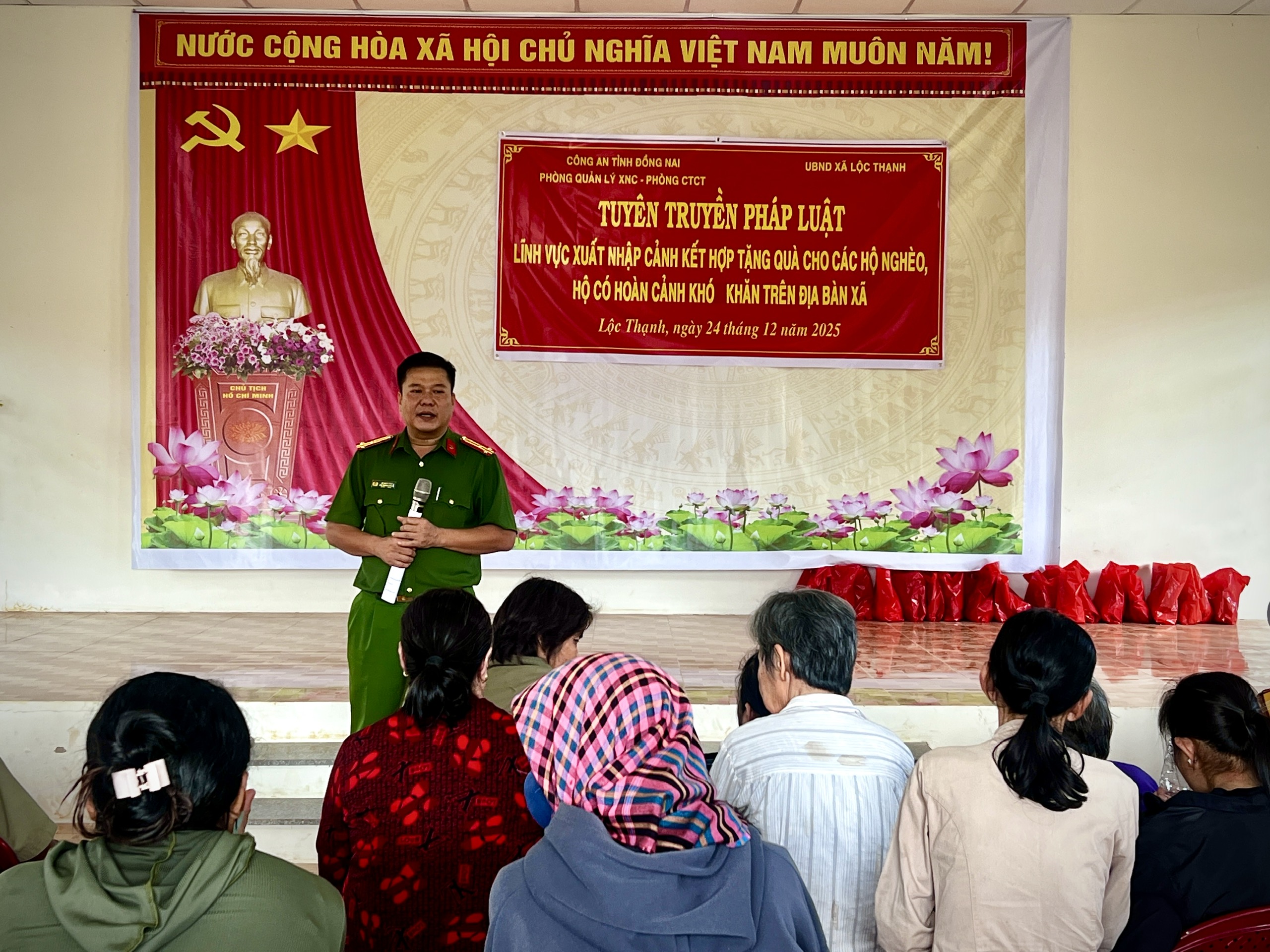 Chiều 24-12, Phòng Quản lý Xuất nhập cảnh (PA08) và Phòng Công tác chính trị, Công an tỉnh Đồng Nai phối hợp với Đảng ủy – HĐND – UBND – UBMTTQ Việt Nam xã Lộc Thạnh đã tổ chức các hoạt động an sinh xã hội và tuyên truyền, phổ biến pháp luật cho Nhân dân trên địa bàn.