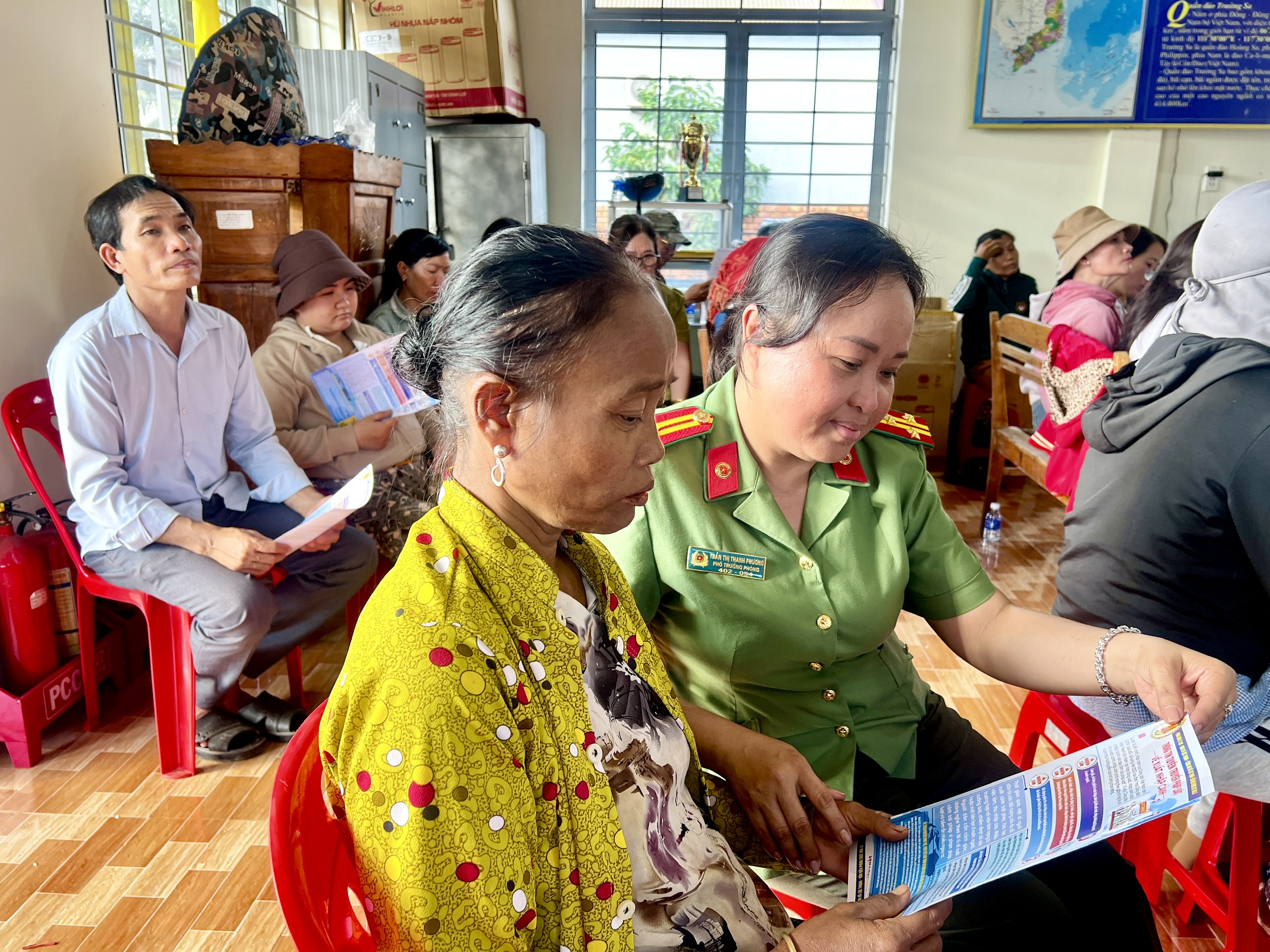 Thượng tá Trần Thị Thanh Phương - Phó Trưởng phòng PA08 trao đổi với người dân về về xuất nhập cảnh, cư trú, an ninh mạng, những rủi ro, hậu quả của việc xuất nhập cảnh trái phép sang Campuchia tìm kiếm việc làm