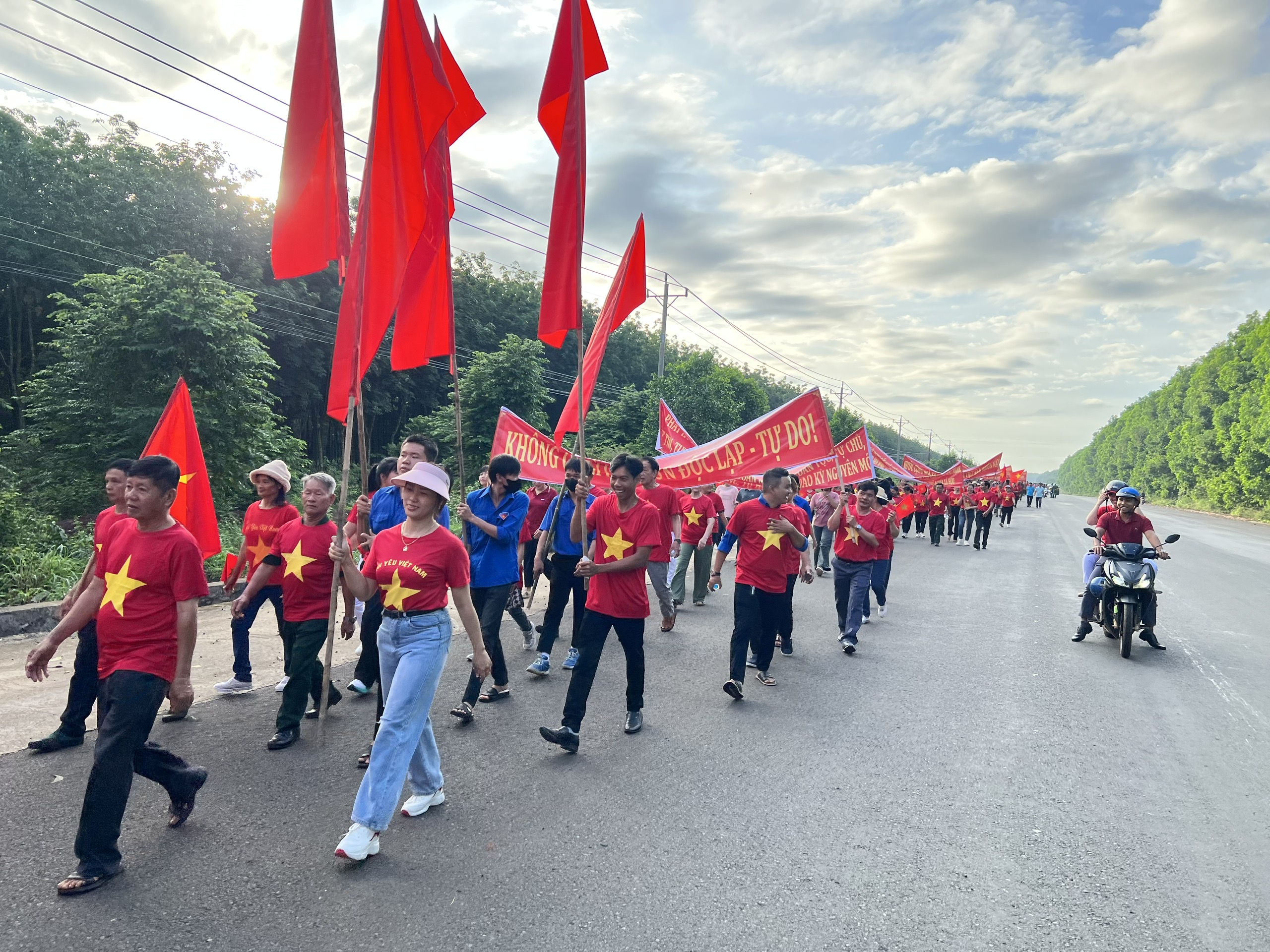 Cán bộ, công chức, viên chức và nhân dân trong sắc cờ đỏ sao vàng, băng rôn, khẩu hiệu, tham gia diễu hành đi bộ khoảng 3km( từ trụ sở UBND xã Lộc Thạnh theo Quốc lộ 13 hướng về Cửa khẩu quốc tế Hoa Lư).