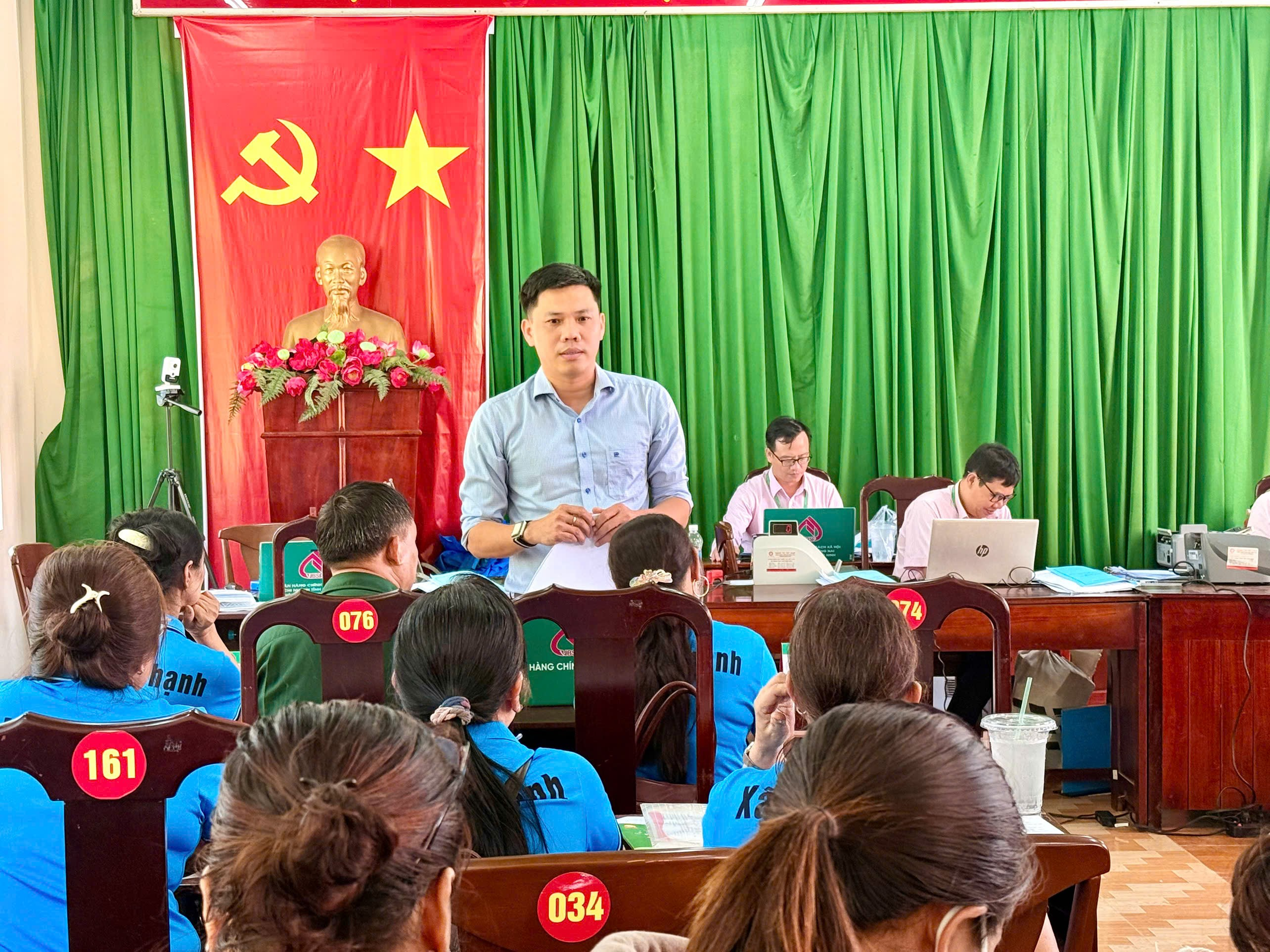 Lãnh đạo Phòng giao dịch NHCSXH Lộc Ninh phổ biến các quy định khi vay vốn NHCSXH đến khách hàng tại điểm giao dịch Lộc Thạnh ngày 07/4/2026