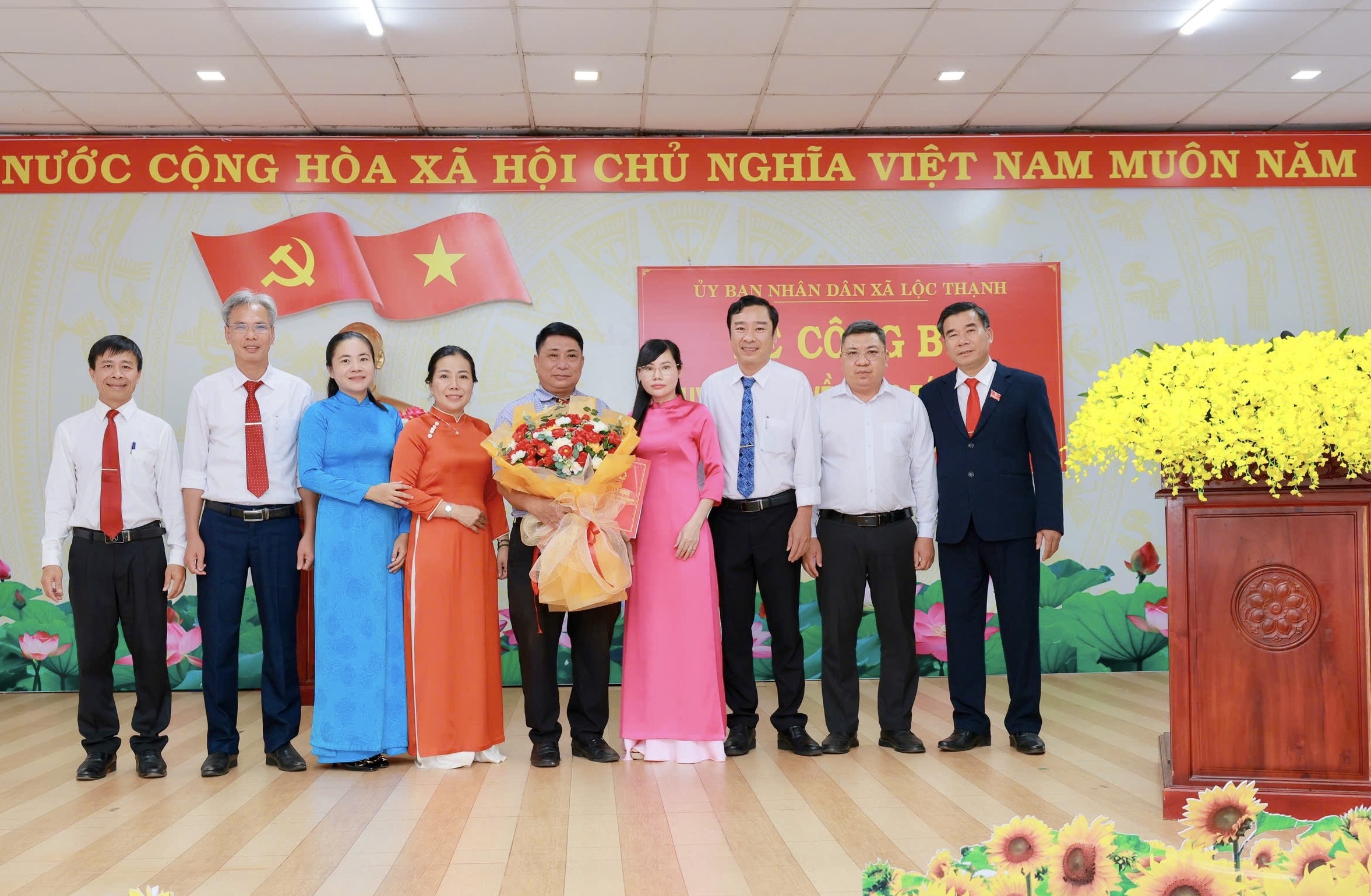 Tại buổi lễ, ông Trần Hoàng Trực, Tỉnh ủy viên, Bí thư Đảng ủy, Chủ tịch HĐND xã Lộc Thạnh và ông Nguyễn Văn Thảo, Phó Bí thư Đảng ủy, Chủ tịch UBND xã trao Quyết định và tặng hoa chúc mừng ông Nguyễn Xuân Cường.
